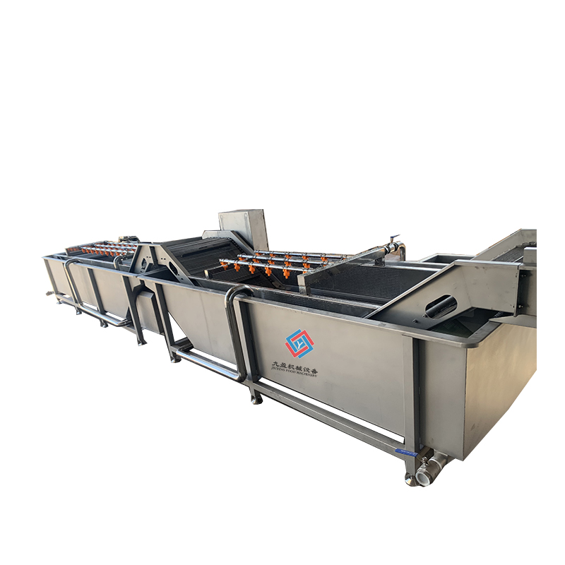 九盈毛菜加工生產(chǎn)線:蔬菜由暫存區(qū)進入人工挑選段進行初步挑選,其目的為除黃葉、爛葉、等不良品;初選后由人工投料,放入自動進入提升機鼓泡清洗機進行粗洗,在此過程中經(jīng)過鼓泡、噴淋、沖浪等多次清洗;粗洗后的蔬菜由整條連接的刮板帶動前行自動進入二次清洗(精洗),同樣經(jīng)過鼓泡、噴淋、沖浪、等多次清洗與殺菌,水箱內(nèi)安裝有臭氧殺菌裝置,可同時清洗并進行殺菌。該清洗設(shè)備自帶循環(huán)水裝置,水箱內(nèi)部為循環(huán)水。水箱內(nèi)部安裝有自帶加水裝置,經(jīng)過精洗后的蔬菜連接清洗風(fēng)干機進行風(fēng)干,進入風(fēng)干機后,經(jīng)過多次吹干后,該設(shè)備可連接作業(yè)臺及時進行包裝,保證清洗后的蔬菜干凈新鮮。